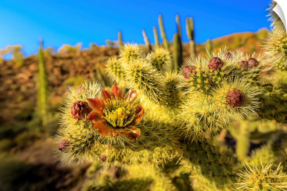 <p>A close up of cactus flower of the jumping choola in Valle de Los Cirios, Fauna and Flora Protected area on the Baja Peninsula.</p>