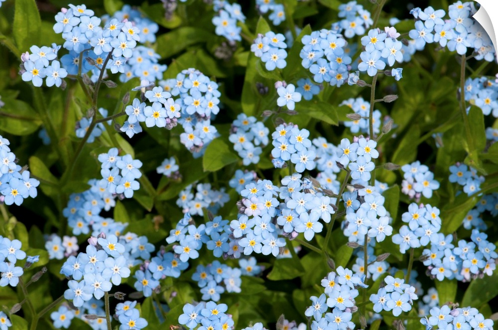 <p>A cluster of forget me not flowers, Myosotis species, in springtime.</p>