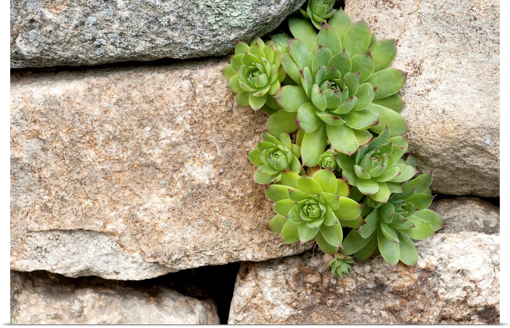 <p>Close up photo of green plant houseleeks growing in the cracks of large stones.</p>