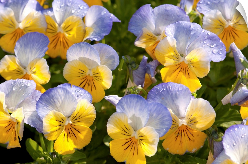 <p>A cluster of yellow and blue pansies, Viola species, with raindrops.</p>