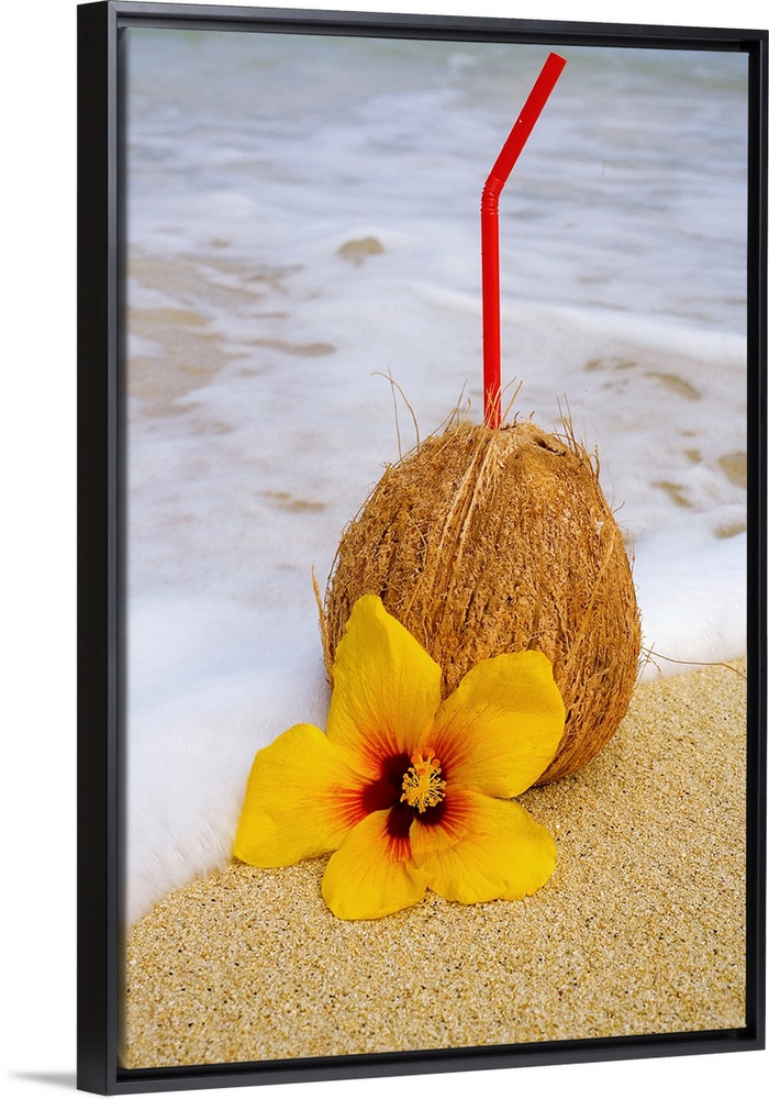 <p>A coconut drink with straw sticking out and flowers on a tropical beach.</p>