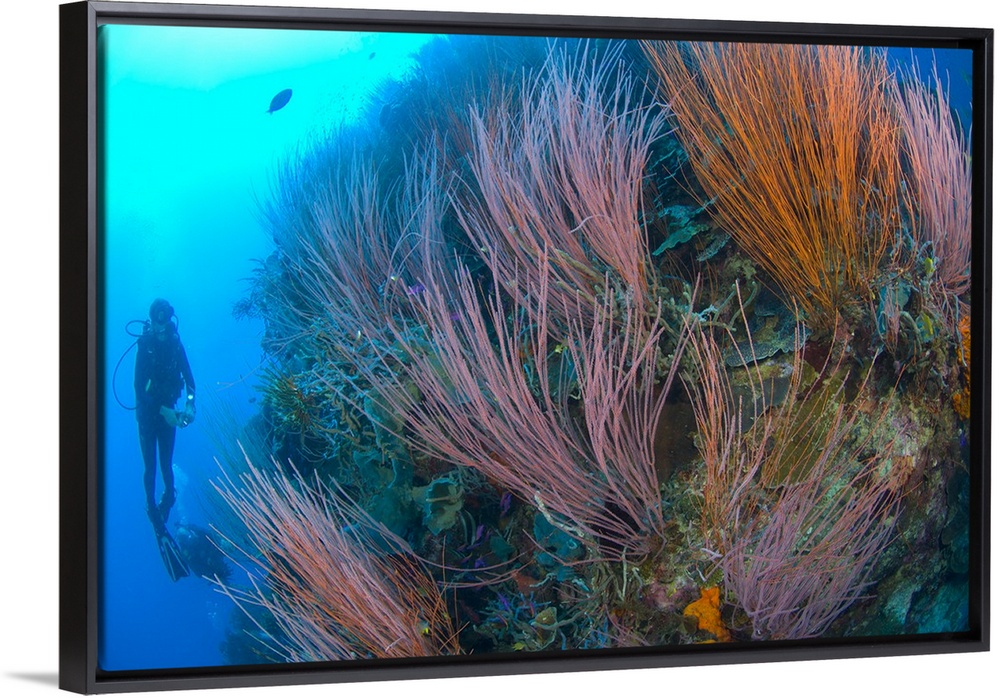 <p>A colony of red whip fan corals with diver, Papua New Guinea.</p>