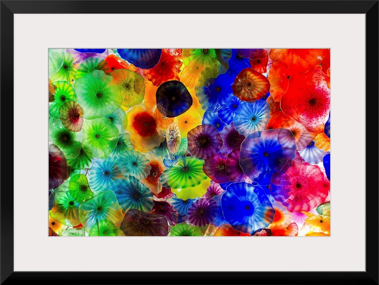 <p>A colorful mouth-blown glass sculpture hanging from a ceiling.</p>