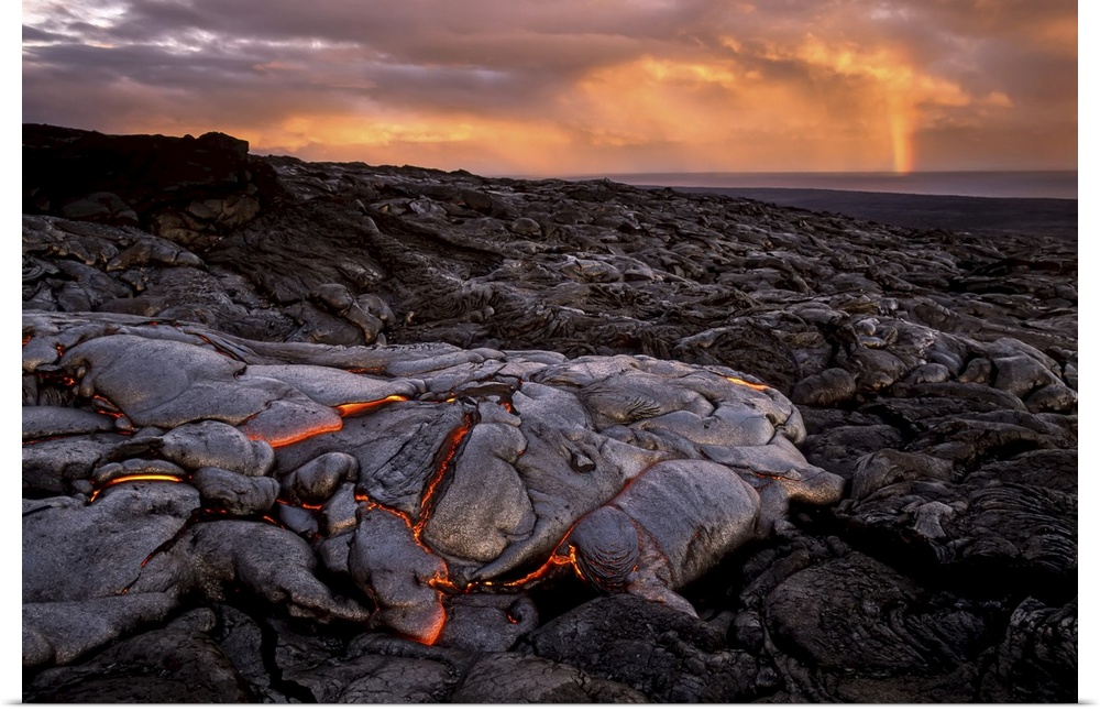 <p>A cooling lava flow on Kilauea, and distant rainbow over the water.</p>
