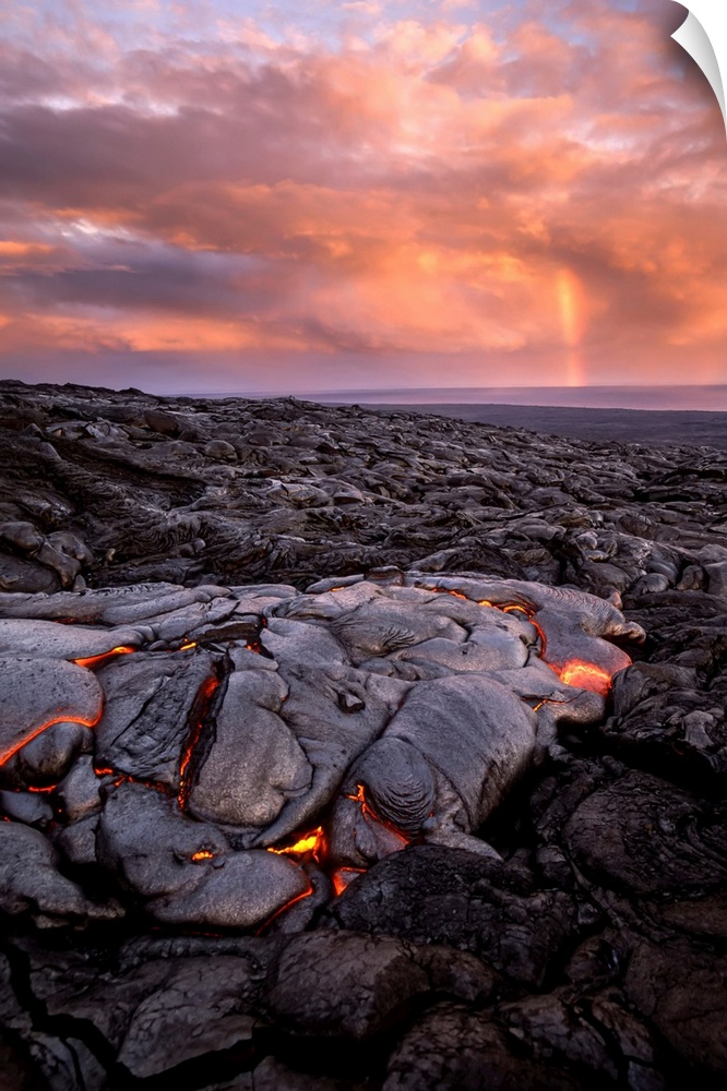 <p>A cooling lava flow on Kilauea, and distant rainbow over the water.</p>