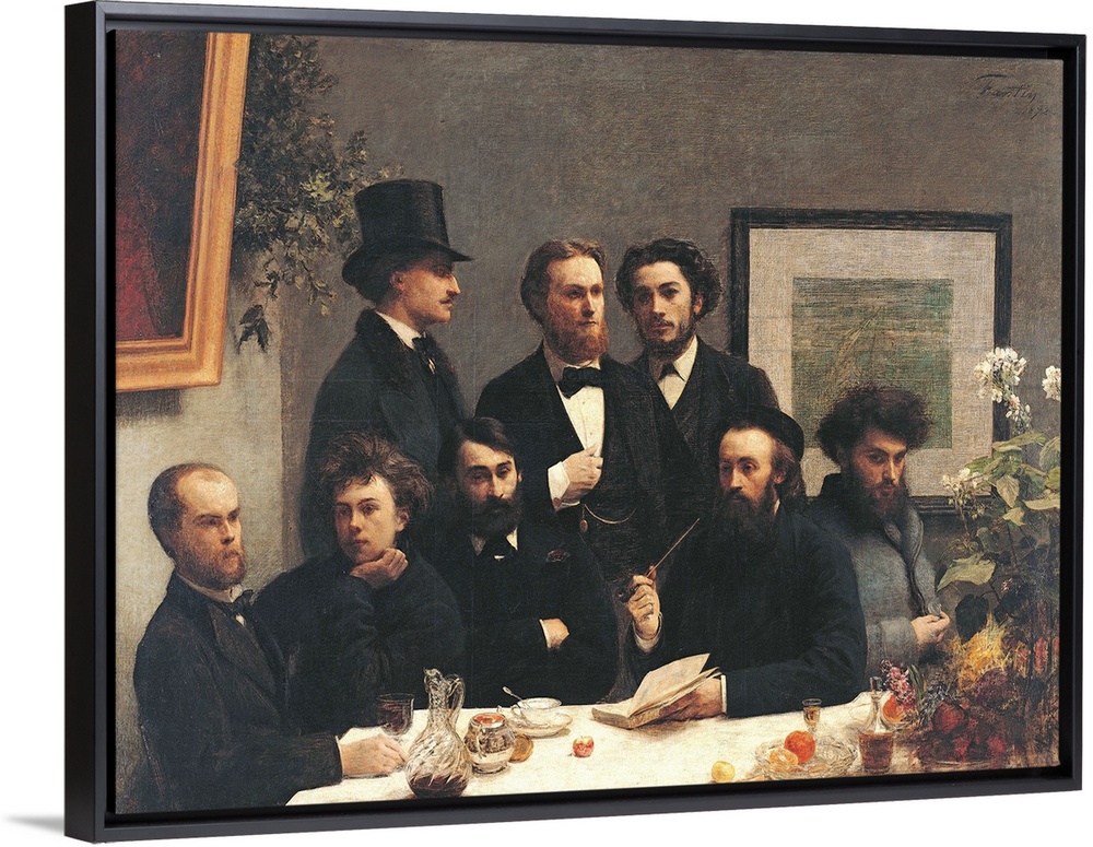<p>Corner table : Representation of a meeting between, from left to right : Paul Verlaine, Arthur Rimbaud, Elzear Bonnier, Leon Valade, Emile Blemont, Jean Aicart, Ernest d'Hervilly, Camille Pelletan. Painting by Henri Fantin Latour (Fantin-Latour, 1836-1904). 1,60 x 2,25 m. 1872. Orsay museum, Paris</p>