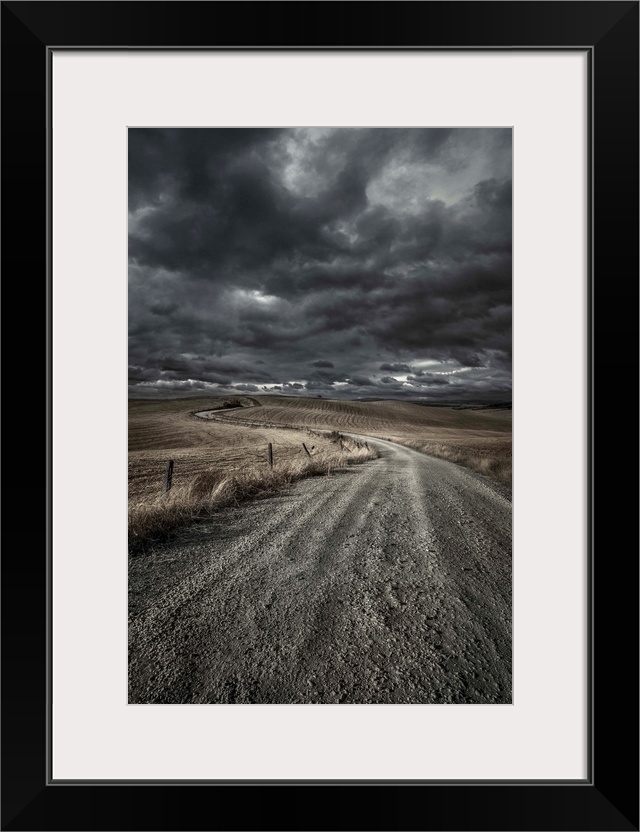 <p>A country road in field with stormy sky above, Tuscany, Italy.</p>