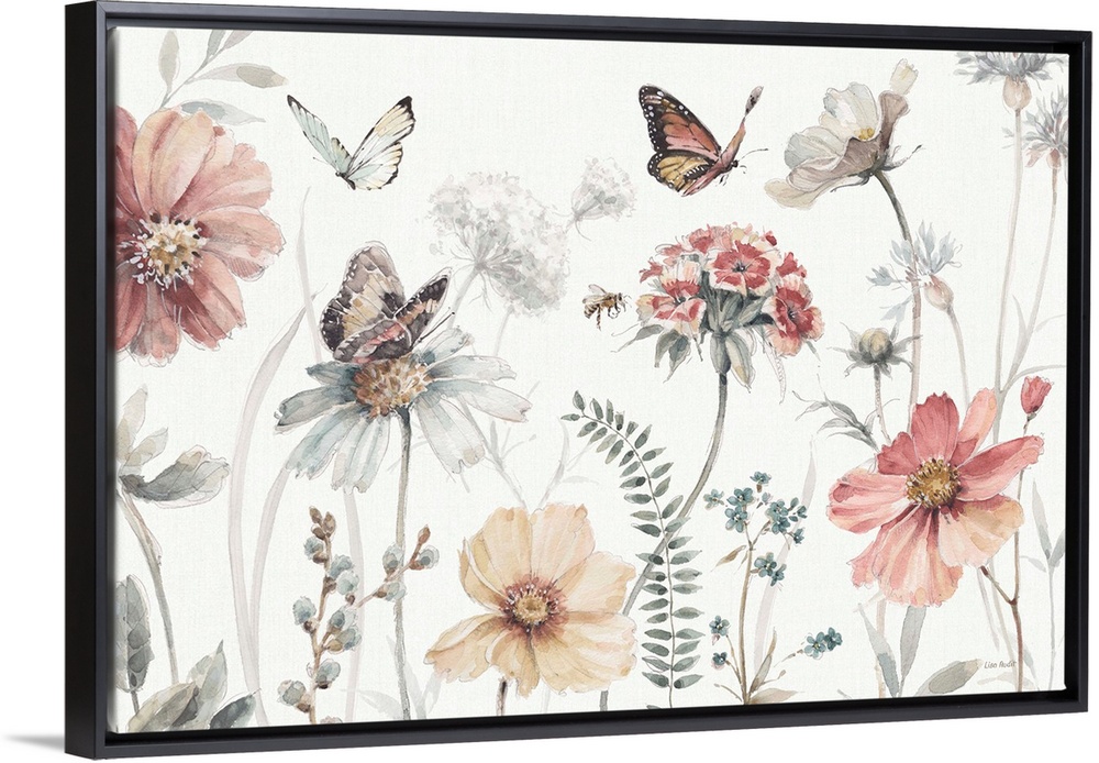 <p>Contemporary country artwork of wildflowers with fluttering butterfly over a white background.</p>