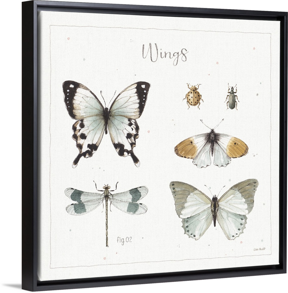 <p>Watercolor painting of a variety of types of inspects on an off white background with a thin line border and the word "Wings."</p>