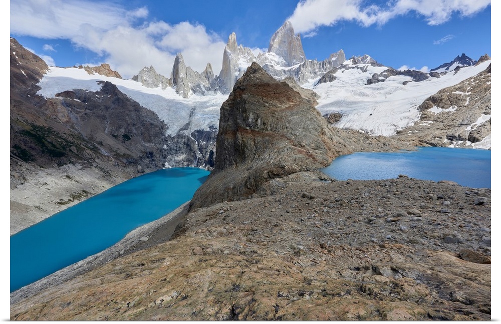 <p>A couple in mountain gear rests on rocks with view to Lago de los Tres and Mount Fitz Roy, Patagonia, Argentina, South America</p>