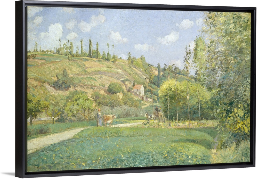 <p>This view shows one of the roads connecting the hamlet of Valhermeil in Auvers with Pontoise, the village northwest of Paris where Pissarro lived for many years. Between 1873 and 1882, he painted some twenty works in this area, several featuring the same red-roofed house. The subject, villagers walking on paths through the French countryside, was one of the artist's favorites, reflecting his interest in the pulse of daily rural life. Made in 1874, the year of the first Impressionist exhibition, this picture demonstrates Pissarro's adaptation of the looser touch, broken brushstrokes, and lighter palette of younger colleagues like Monet.</p>