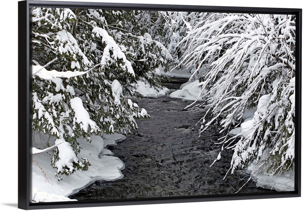 <p>A Creek Running Between Snow-Covered Trees</p>