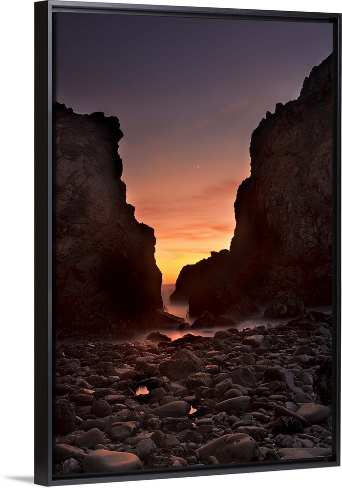 <p>A crescent moon sets through a dusk-colored sky at Pfeiffer Beach, Big Sur, California, USA.</p>