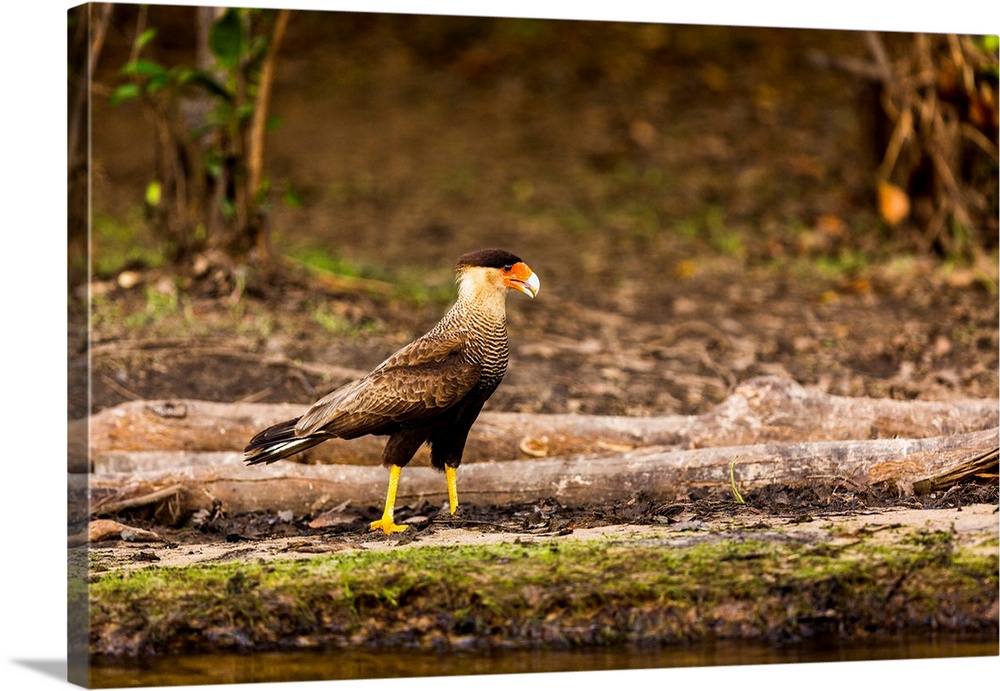 <p>A crested caracara walks along a river bank in the Brazilian Pantanal with a reflection showing on the brown river water.</p>