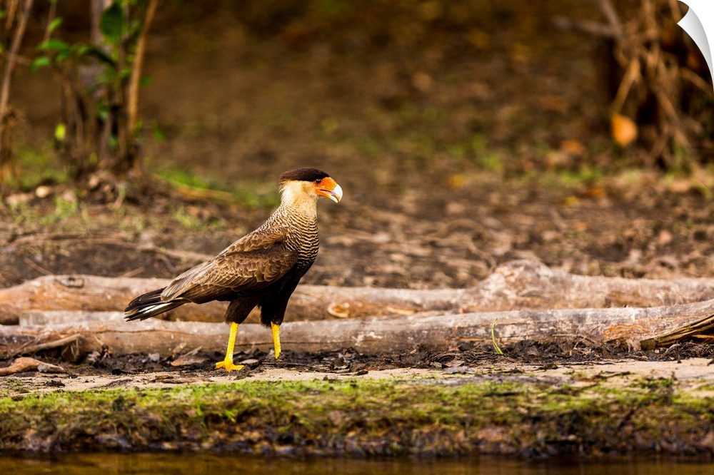 <p>A crested caracara walks along a river bank in the Brazilian Pantanal with a reflection showing on the brown river water.</p>