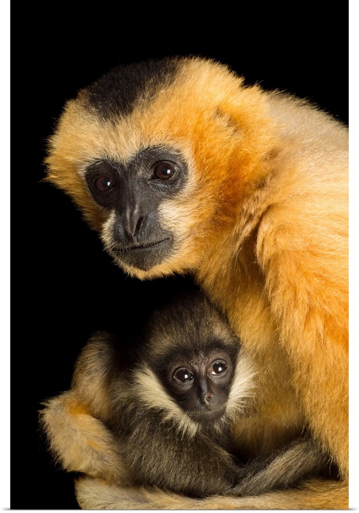 <p>A critically endangered female Northern white cheecked gibbon with her year old baby, Nomascus leucogenys, at the Gibbon Conservation Center.</p>