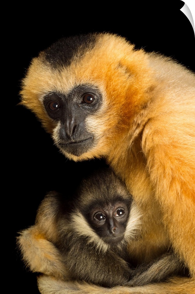 <p>A critically endangered female Northern white cheecked gibbon with her year old baby, Nomascus leucogenys, at the Gibbon Conservation Center.</p>