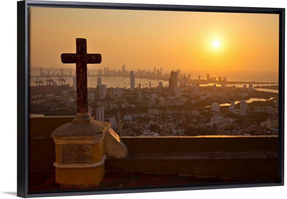 <p>A cross with the Cartagena skyline in the distance at sunset.</p>