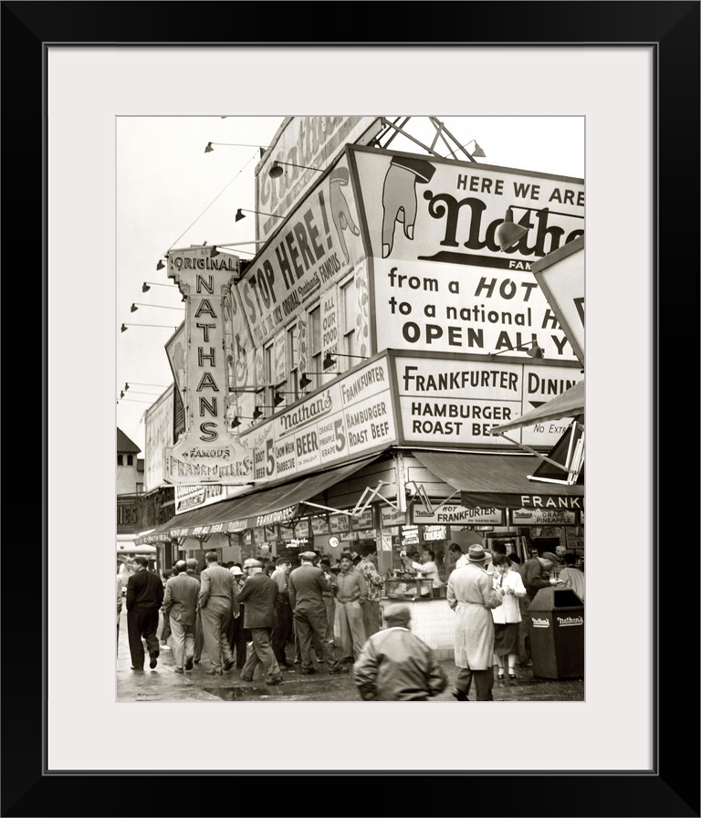 <p>A crowd outside of Nathan's Famous in Coney Island, Brooklyn, New York. Photograph by Al Ravenna, 1954.</p>
