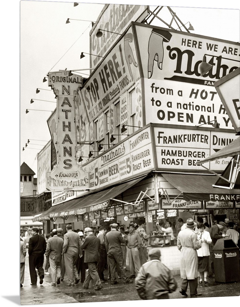 <p>A crowd outside of Nathan's Famous in Coney Island, Brooklyn, New York. Photograph by Al Ravenna, 1954.</p>
