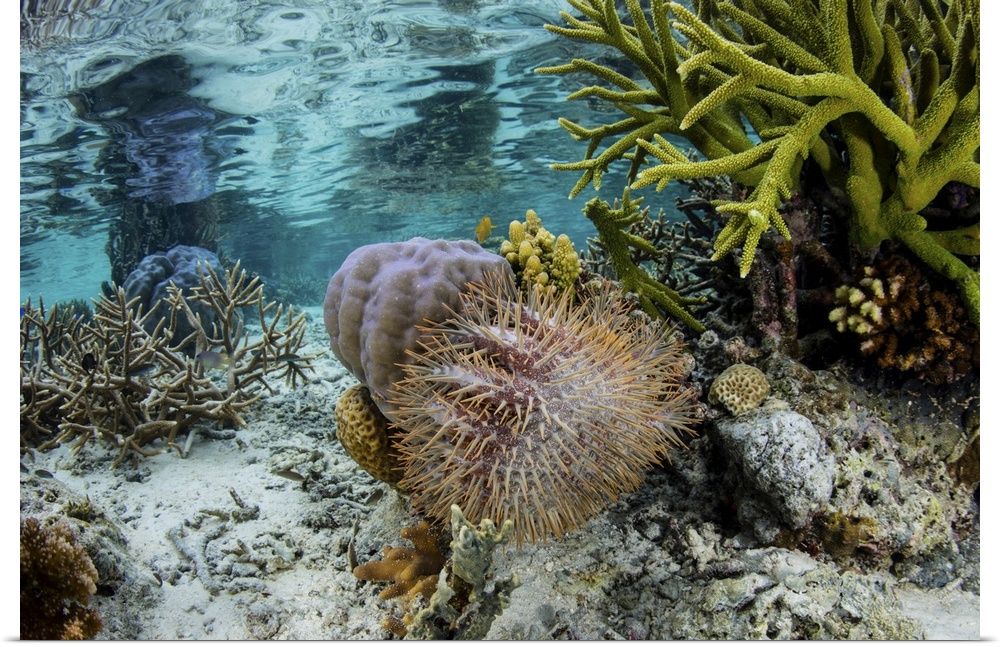<p>A crown-of-thorns sea star feeds on a living coral colony in Raja Ampat, Indonesia.</p>