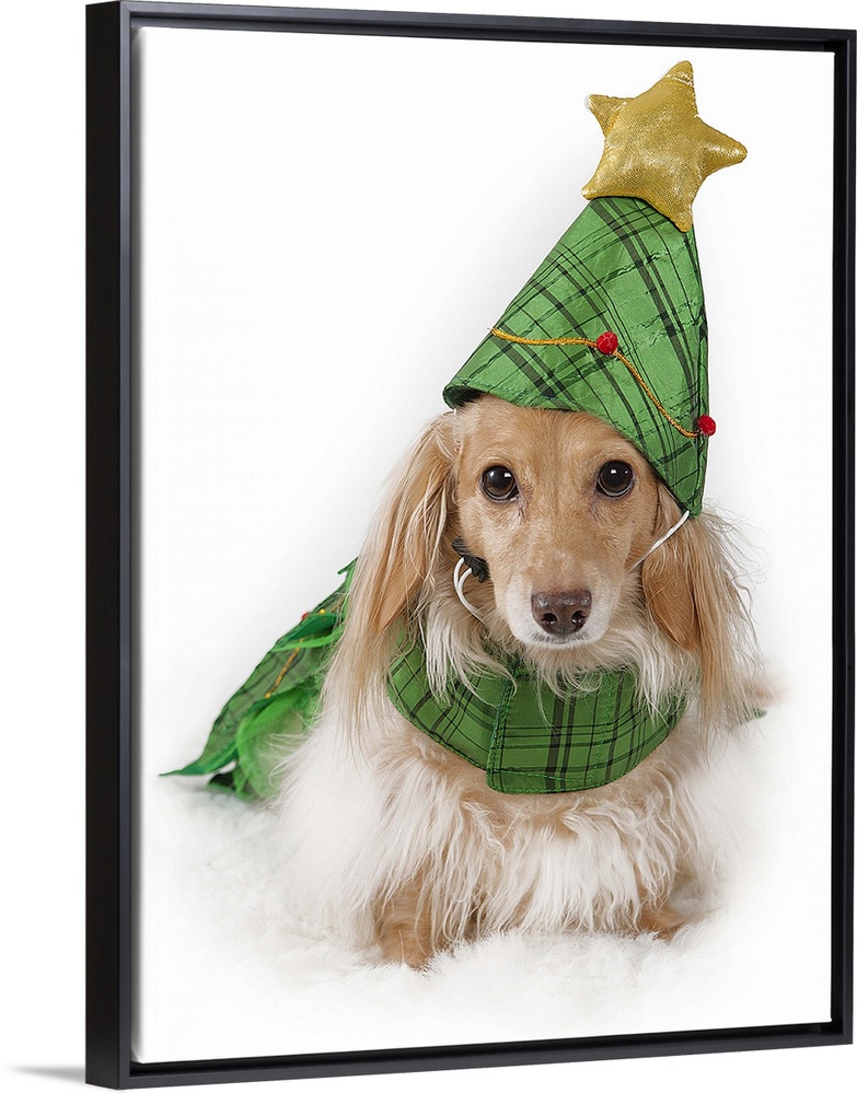 <p>Longhaired miniature dachshund, blonde (English cream) wearing Christmas tree costume.</p>