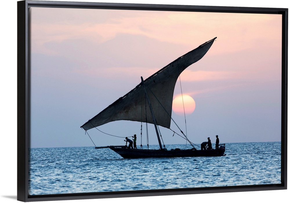 <p>A Dhow Sails In Front Of The Setting Sun, Stone Tpwn, Zanzibar, Tanzania</p>