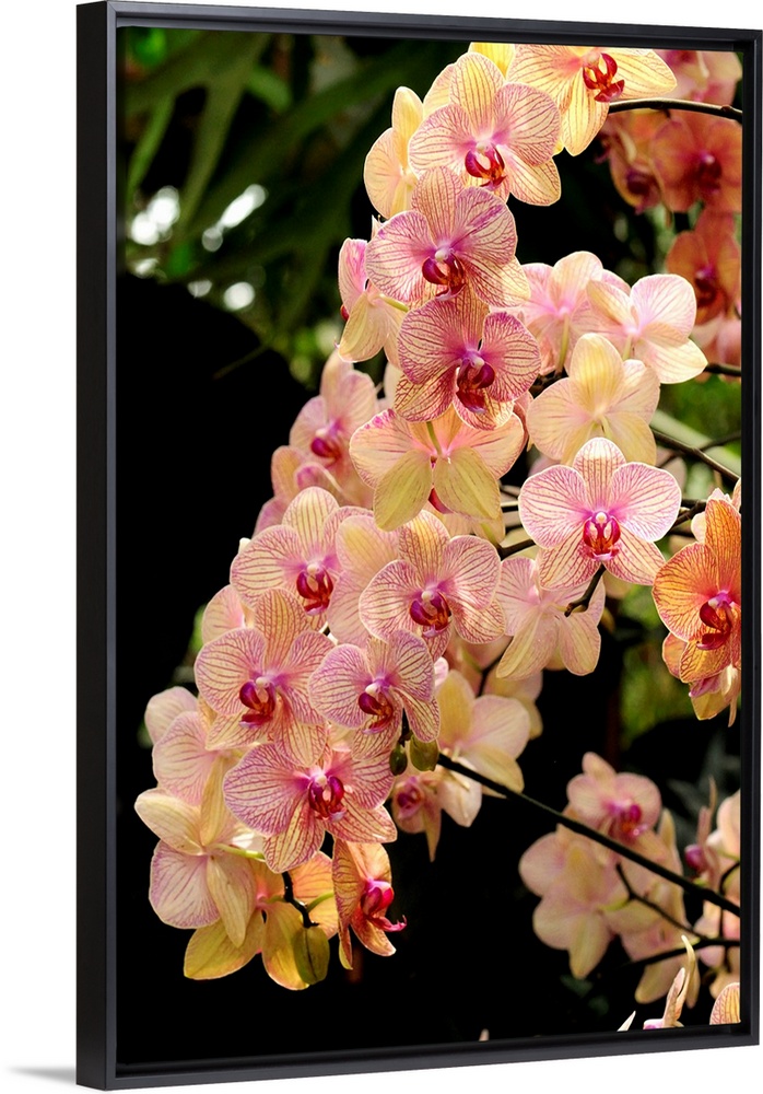 <p>A display of a large cluster of Phalaenopsis orchids.</p>