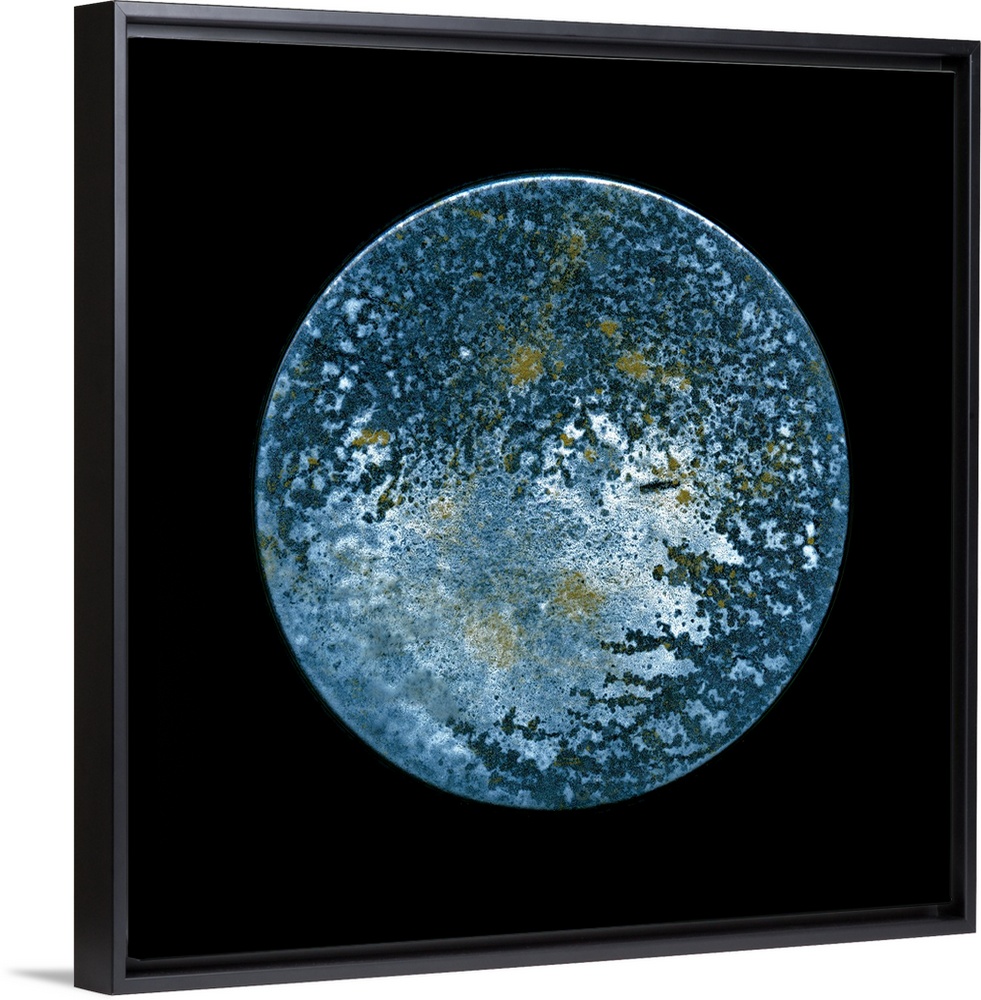 <p>A minimalist circular surreal moon on a black background in textured blues and silvery shades.</p>