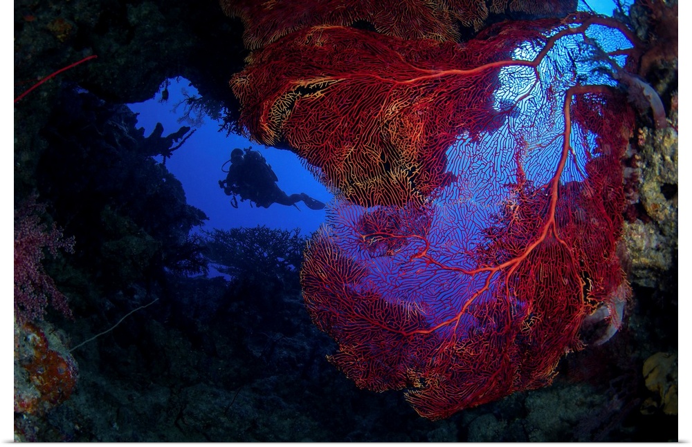 <p>A diver enters a cave full of sea fans, Kadavu Island, Fiji.</p>