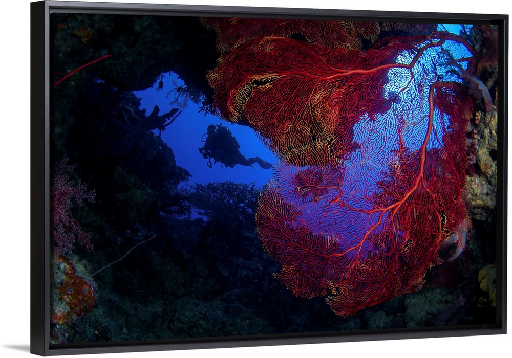 <p>A diver enters a cave full of sea fans, Kadavu Island, Fiji.</p>
