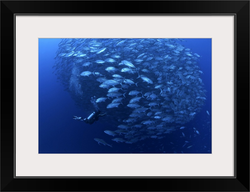 <p>A diver enters a school of bigeye trevally (Caranx sexfasciatus) in Balicasag Island, Philippines.</p>