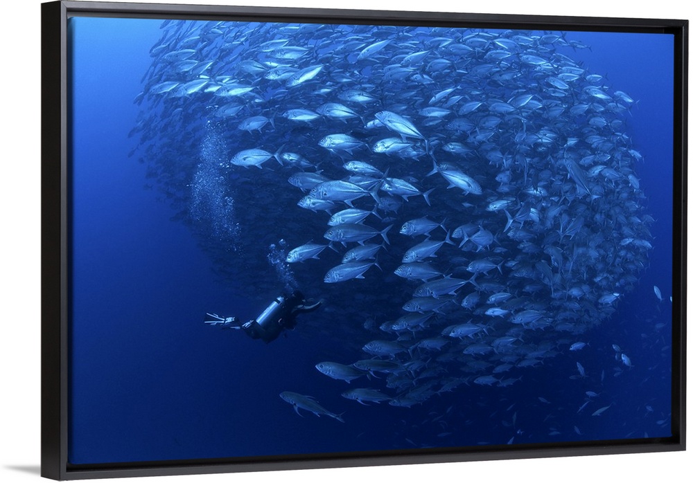 <p>A diver enters a school of bigeye trevally (Caranx sexfasciatus) in Balicasag Island, Philippines.</p>