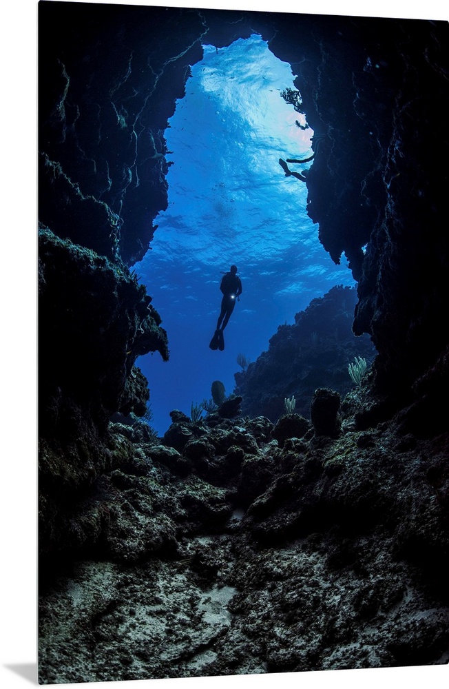 <p>A diver stops at the entrance to an underwater cave in Grand Cayman, Cayman Islands.</p>