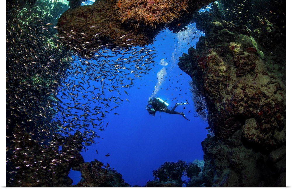 <p>A diver swims past a cave full of glass fish in the Red Sea.</p>