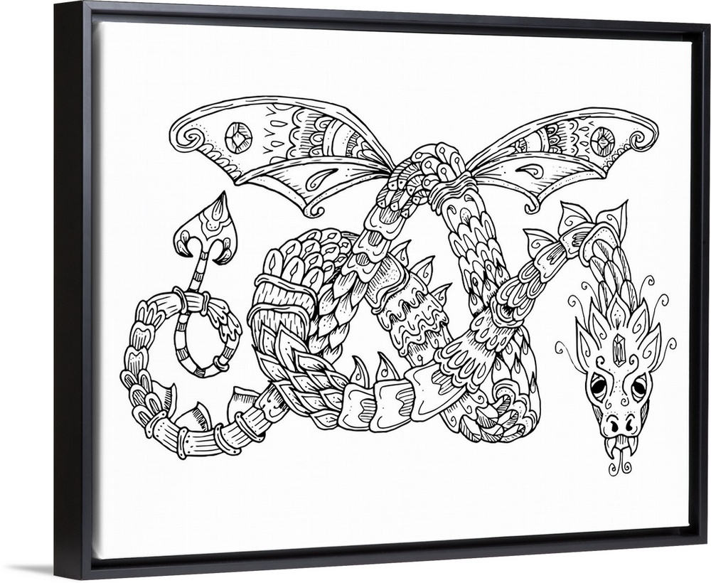 <p>Line art of a long, winged dragon with patterned scales.</p>