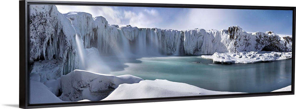 <p>Icy snow covered landscape with waterfalls streaming down from cliffs surrounding a river.</p>