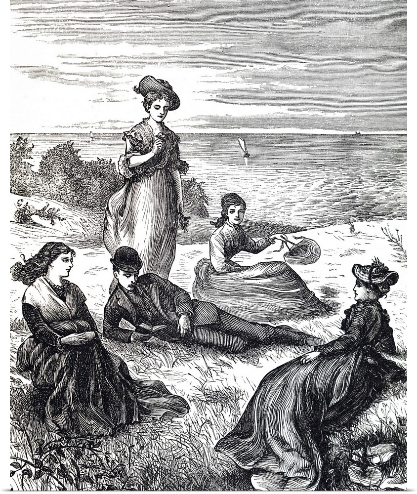 <p>Illustration depicting a family relaxing on a grassy bank looking out onto the sea. Dated 19th century.</p>