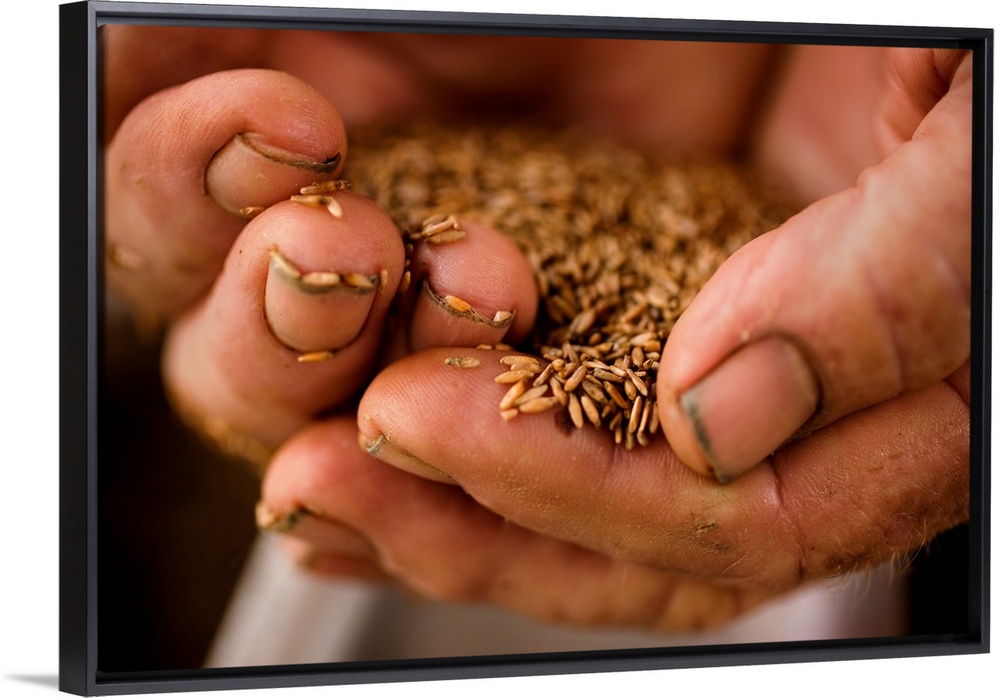 <p>A farmer holds sea oats seeds in his hard worked, dirty hands</p>
