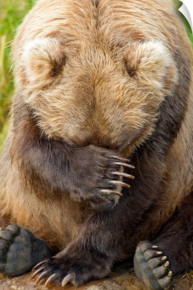 <p>A brown bear rests while sitting on the bank of a small stream in Katmai National Park, Alaska.Grizzly Creek.</p>
