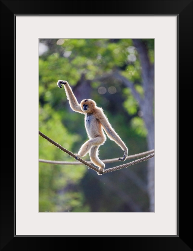 <p>A female buff-cheeked gibbon easily walks across a suspended rope.</p>