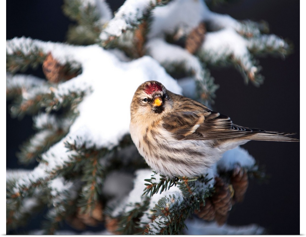 <p>A female Common Redpoll (Carduelis flammea) perches on a snowy spruce tree on a cold day in Interior, Alaska.</p>