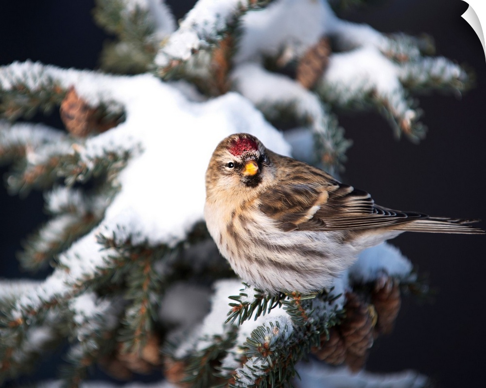 <p>A female Common Redpoll (Carduelis flammea) perches on a snowy spruce tree on a cold day in Interior, Alaska.</p>