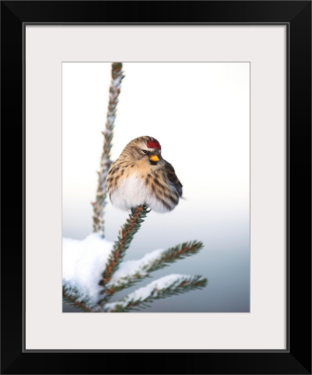 <p>A female Common Redpoll (Carduelis flammea) perches on a snowy spruce tree on a cold day in Interior, Alaska.</p>
