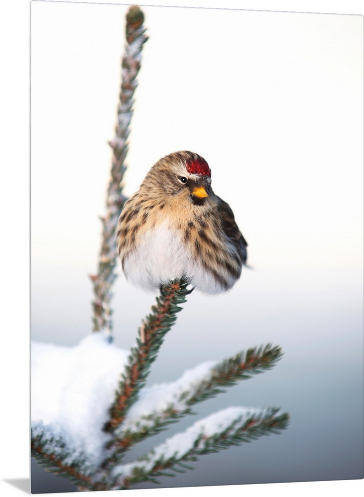 <p>A female Common Redpoll (Carduelis flammea) perches on a snowy spruce tree on a cold day in Interior, Alaska.</p>
