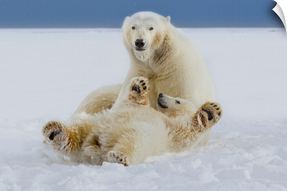 <p>A female polar bear and her cub play in the snow at the edge of the Beaufort Sea ice pack, in ANWR, Northern Alaska.</p>
