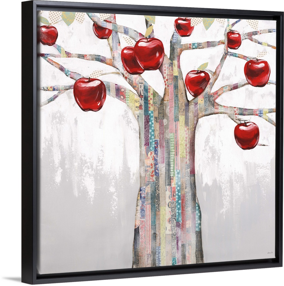 <p>Contemporary painting of a tree with bright red apples hanging form the branches.</p>