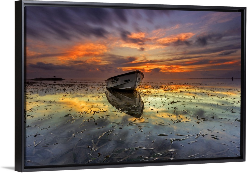 <p>Dramatic sunset over a seascape with a row boat in the foreground.</p>