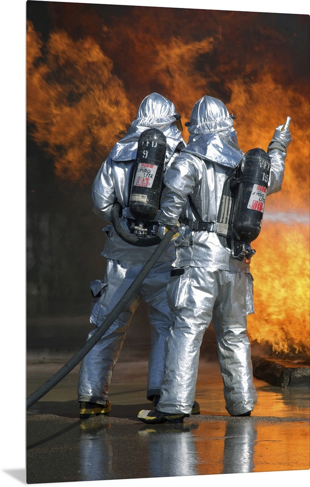 <p>Volk Field Air National Guard Base, Wisconsin, September 21, 2004 - A firefighter fights a fire during a readiness training exercise.</p>