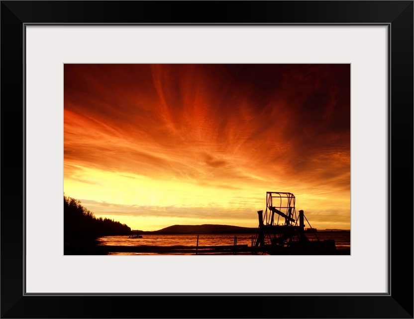 <p>A fish wheel spins during an early morning sunrise on the Tanana River near the village of Tanana. Interior, Alaska summer.</p>